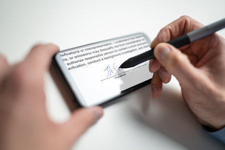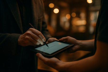 Person signing electronic signature on a tablet using stylus, completing a paperless transaction or contract agreement