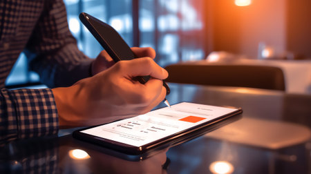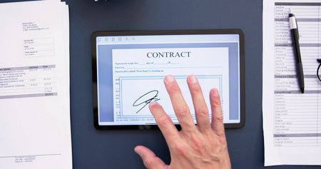 Generative AI : Esigning electronic signature document management paperless office concept Closeup of businessman using stylus pen signing on e contract on digital tablet on tablet