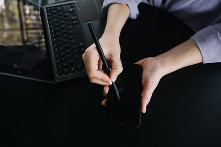 A close-up view of a person using a smartphone with a stylus, highlighting the interaction with applications on a wooden table, creating a cozy workspace atmosphere.