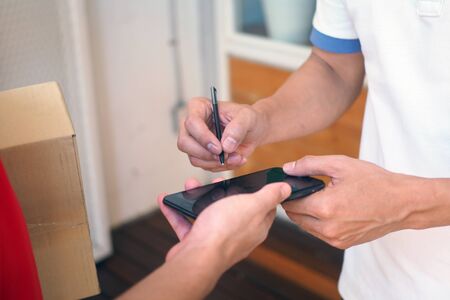 asian woman customer appending signature in digital mobile tablet receive parcel box from home delivery service man in red uniform at home, express home delivery service and online shopping concept