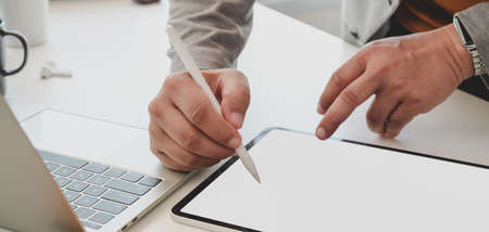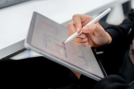 Close up hand of businessman use pen with tablet. Concept of technology for business.