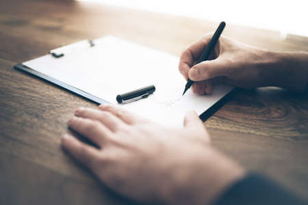 Contract signing concept. Businessman hand with pen over document closeup. banner