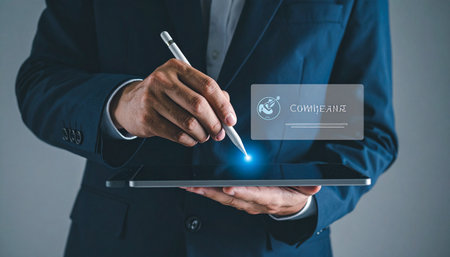 A businessman in a suit uses a stylus to electronically sign a document on a futuristic tablet.