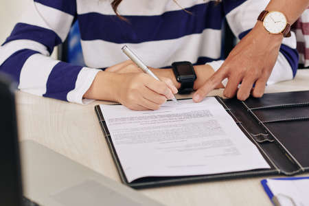 Close up of female hands signing business contract. Concept of female business, online education, professional occupation