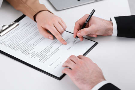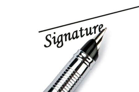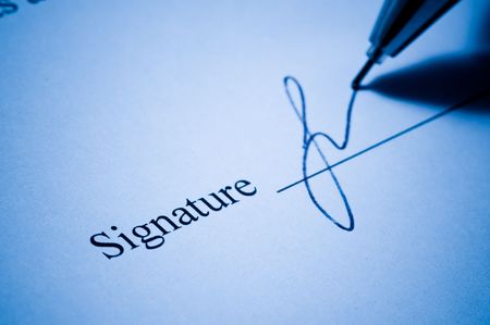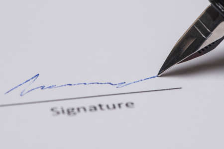 signature with pen on contract documents. Contract agreement, approve, law and deal concepts