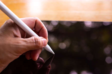 Bangkok Thailand - July 15, 2019 : Woman's hand holding Apple pencil writing Black tablet computers iPad Pro on wood table, Technology, Business concept, Apple pencil was created and developed by the Apple inc.