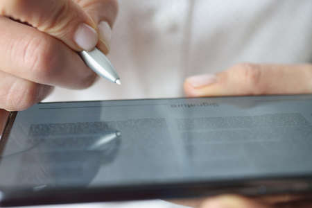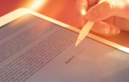 Woman hand holds stylus and puts an electronic signature in contract on tablet