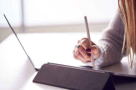 Close Up Of Businesswoman Working From Home Drawing On Digital Tablet Using Stylus Pen
