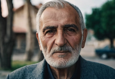 An elderly Armenian man stands in quiet contemplation, his wise gaze reflecting years of life experiences. The gentle light of dusk enhances the charm of the village around him.