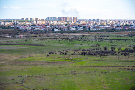 View of Döşemealtı, Yenikoy from Karain cave. A flock of sheep grazing in lush green meadows in front. New apartment blocks and the organized industrial zone stretching to the sky