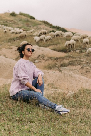 Happy young woman in a sweater against herds of sheep in the mountains
