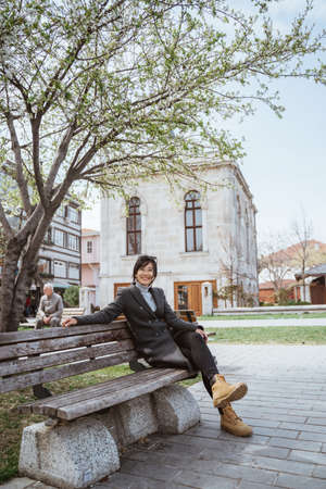 portrait of woman relaxing in the city with old building