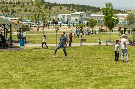 Eskisehir, Turkey - May 24, 2015: Young man playing ball in a picnic area. People having picnic in a park.