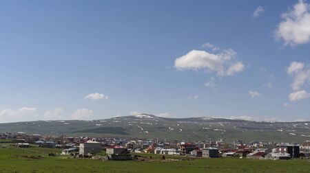 Ardahan, Turkey - May 9, 2019: Panorama Ardahan, Turkey, with green fields and meadows and white, snowy mountains in the background.