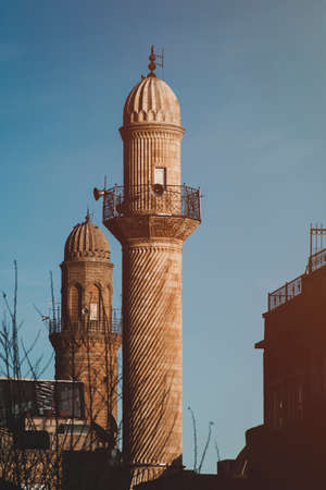 minaret of a historical mosque in mardin turkey and white background