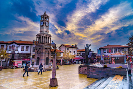 Ankara/Turkey-February 23 2019: Clock tower in Hamamonu district which is popular with old Turkish Houses