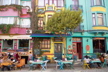 Istanbul, Turkey - November-06.2019: Colorful buildings, cafes and restaurants on the street. It is a touristic street in Sultanahmet area.