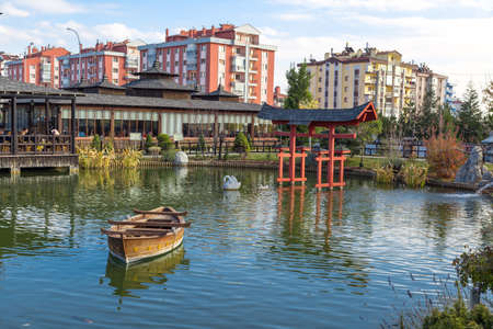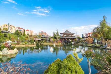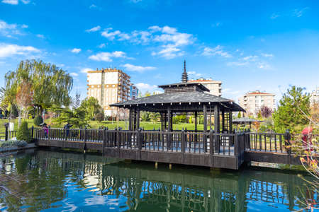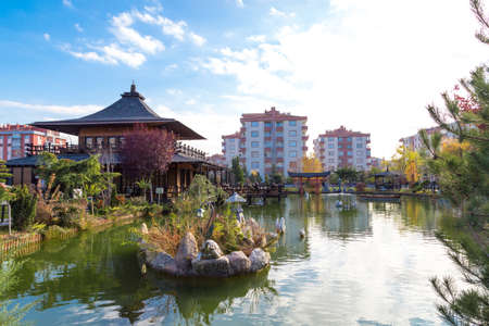 KONYA, TURKEY - NOVEMBER 11, 2017 : Landscape view of Kyoto Japan Garden in Konya with small lake and wooden buildings around, among big apartments on cloudy sky background.