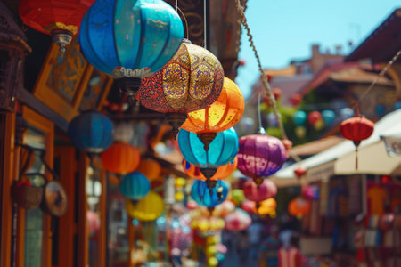 A colorful display of lanterns hangs from a building. The lanterns are of various sizes and colors, creating a vibrant and lively atmosphere. Concept of celebration and festivity