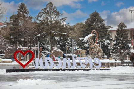 Bursa, Turkey - February 04, 2017: People are taking photos near the fountain in Park of Bursa, Turkey