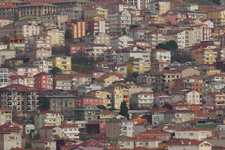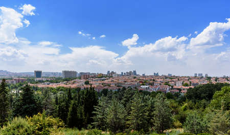 Ankara, Turkey - July 24, 2018: View above of Ankara houses with tiled roofs and skyscrapers in summer cloudy day