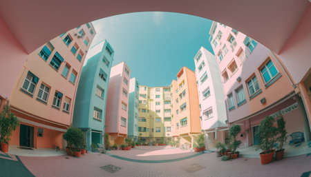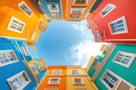 Low angle architectural scene showing blue sky framed by multi-colored buildings, capturing city life and urban perspective.