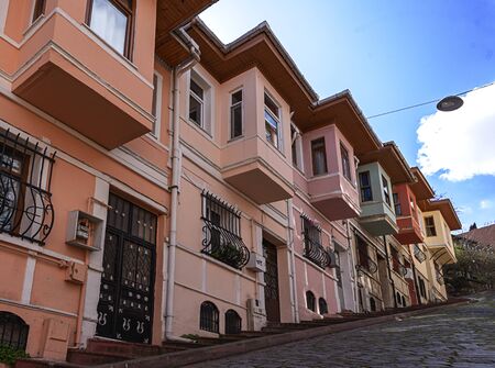 Traditional Turkish houses in Balat district of Istanbul. Travel to Istanbul background photo. Istanbul Turkey - 8.20.2022