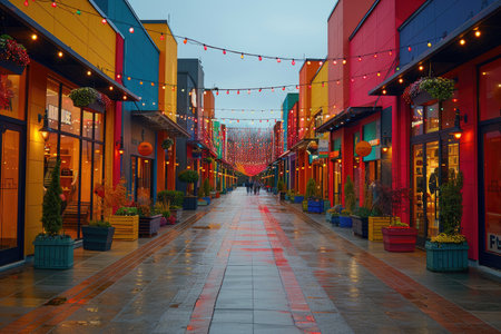 Colorful urban shopping street with vibrant storefronts and string lights