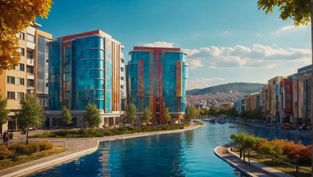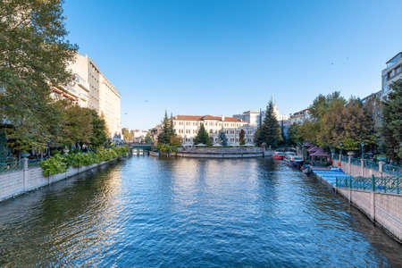 Eskisehir, Turkey - 10.16.2021: Eskisehir street view with Porsuk River canal. Eskisehir is a modern city in center of Anatolia.