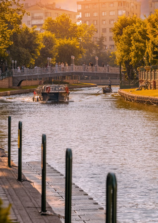 ESKISEHIR, TURKEY - SEPTEMBER 03, 2016: Gondola tours in Porsuk river. Porsuk river is one of the most populer touristy place with boat tours and entertainment in Eskisehir.
