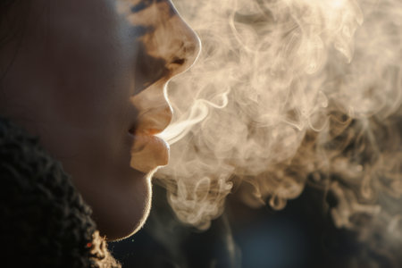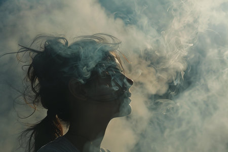 A person's face is obscured by a cloud of smoke. Concept of mystery and unease, as the person's identity is hidden by the smoke. Scene is eerie and unsettling