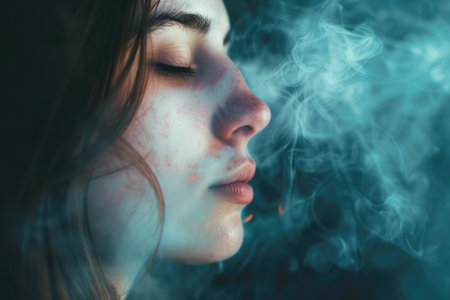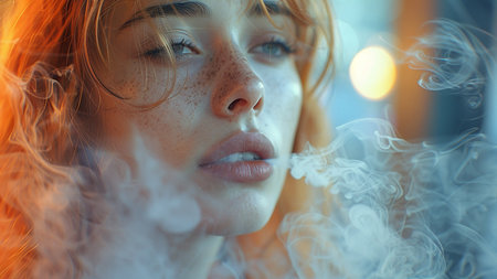 A woman's face is obscured by smoke, creating a sense of mystery and intrigue. The smoke seems to be coming from a source behind her, adding to the atmosphere of the image