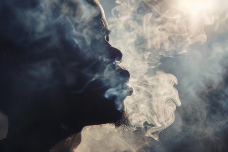 A man is smoking a cigarette and the smoke is covering his face. Concept of discomfort and unease, as the man's face is obscured by the smoke