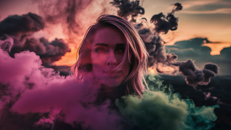 Clouds of colored smoke surrounding a woman. A charming and mysterious atmosphere of an abstract smoky background, captivating you into the cloudy world of erotic fantasies. AI generated.