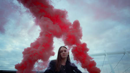 Fashion girl posing at camera in colorful smoke. Portrait of attractive woman holding smoke bombs in hands at street protest. Closeup young activist waving hands in air with smoke grenades outdoors