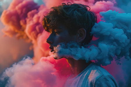 A striking profile silhouette of a young man immersed in colorful smoke, creating a stunning visual that evokes emotion and artistic inspiration, perfect for creative projects.