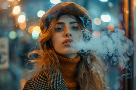 Stylish Woman Exhaling Smoke on City Street at Night.