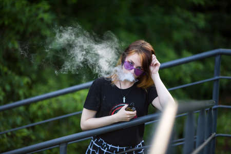 Vape teenager. Young pretty white caucasian girl in purple glasses on her head an electronic cigarette on the street in the summer. Deadly bad habit.