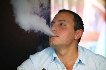 Vaping man. A cloud of vapor. dark blue background.