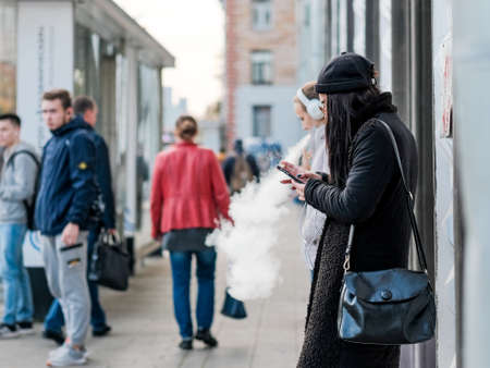 Moscow, Russia. September 30, 2020 A young girl stands in the street with her back against the wall of a house and smokes a cigarette using a modern phone. Tobacco smoke poisons people around.