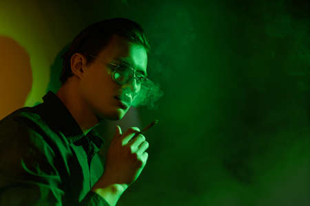 Young man is smoking a cigarette in dark green lighting. Bad habits. Smoke break.