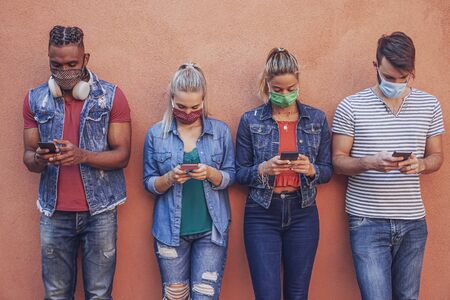 Group of people using their smartphones in covid 19 times protected with face mask - Friends checking online news while standing by the wall and holding cellphones
