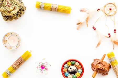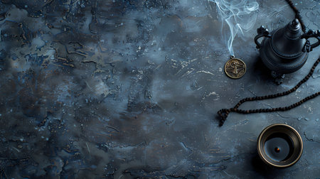 Table with occult attributes, top view. Ganesha figurine, stone rosaries, candles, aroma stick