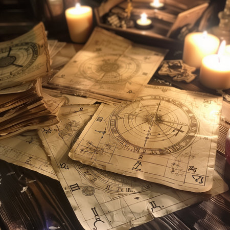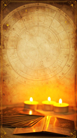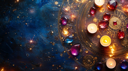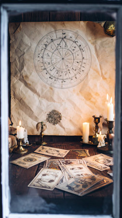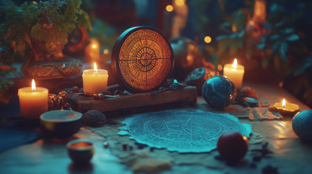 A beautifully crafted astrology wheel placed on a vibrant textile, surrounded by flickering candles. This captivating scene embodies mystical energy and spirituality, ideal for rituals, meditation, and inspiration in esoteric practices.