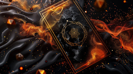 A stunning visual featuring a mystical shield surrounded by cosmic elements and symbols. This captivating scene radiates energy and spirituality.