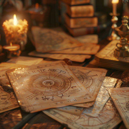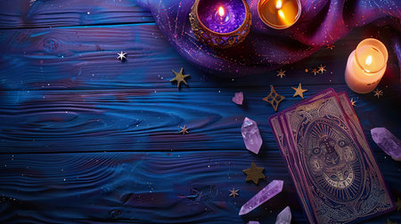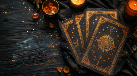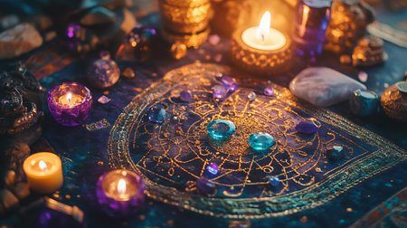 Mystical Tarot Cards with Crystals and Candles for Divination.