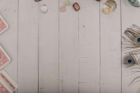 Tarot cards deck on the fortune teller desk table background. Future reading concept.