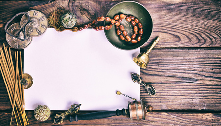 white sheet of paper among Tibetan religious musical subjects for meditation and alternative medicine, empty space