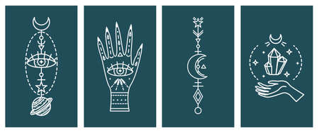Set of mystical astrological vector illustrations. Magic symbols. Zodiac. Astronomy. Line art illustrations.