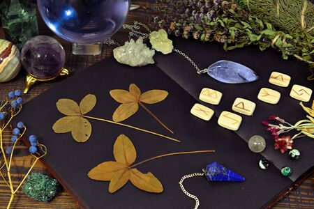 Still life with four-leaf clover, open diary, runes, crystal ball and herbs on witch table. Esoteric, wicca and occult background, fortune telling and divination ritual, mystic concept